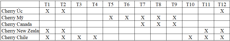 Mùa cherry của một số loại cherry nhập khẩu tại Việt Nam như sau: